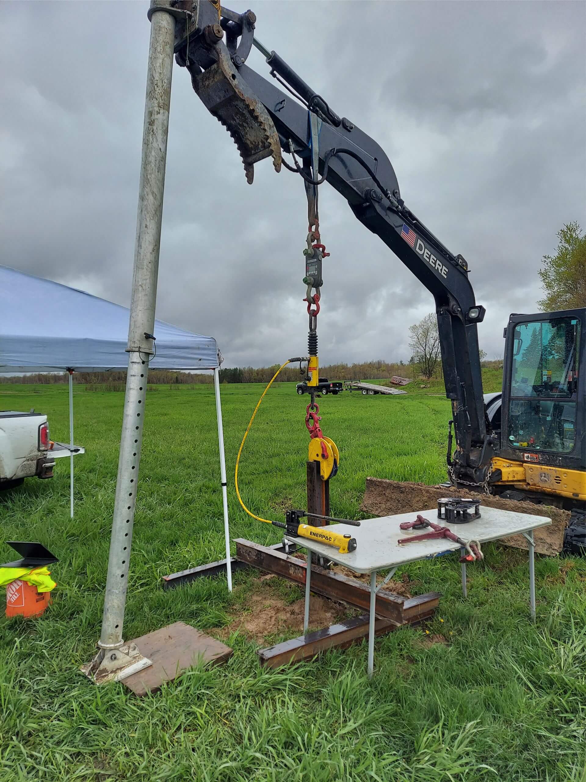 After 72-hours from pile installation, uplift and lateral load tests were performed on each pile. Uplift load testing was performed first and then the lateral load testing afterwards. Once the load tests were completed, piles were removed, and the bottoms of the piles were observed for pile flaring.